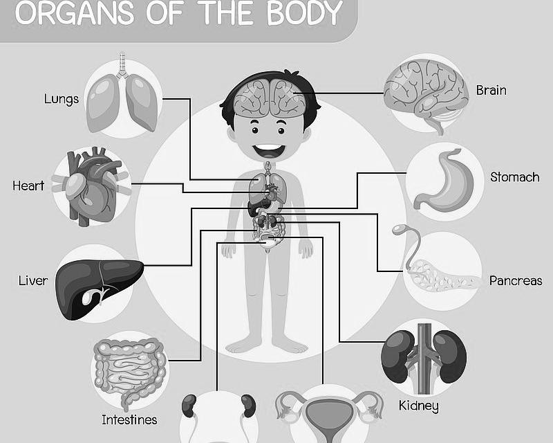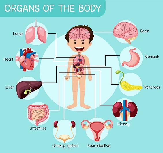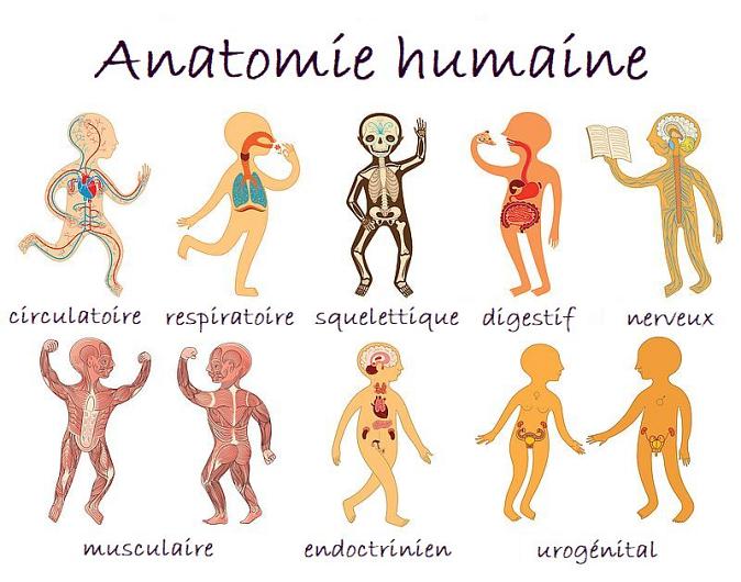 Retrouve les différents organes de ton corps indiqués en anglais sur l'image :